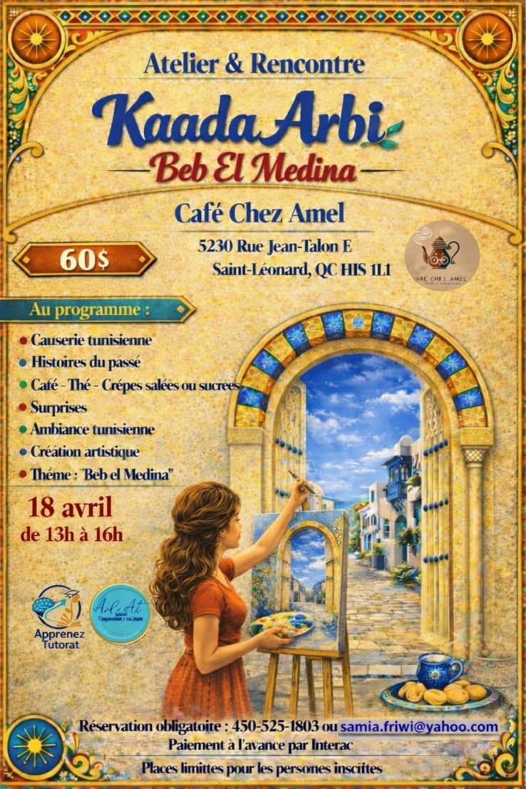 Plongez dans l’univers chaleureux de la Kaada Arbi et laissez-vous transporter par l’âme de la médina tunisienne. Entre histoires du passé, ambiance conviviale et création artistique, cet événement unique vous invite à vivre un moment authentique, riche en partage et en émotions.