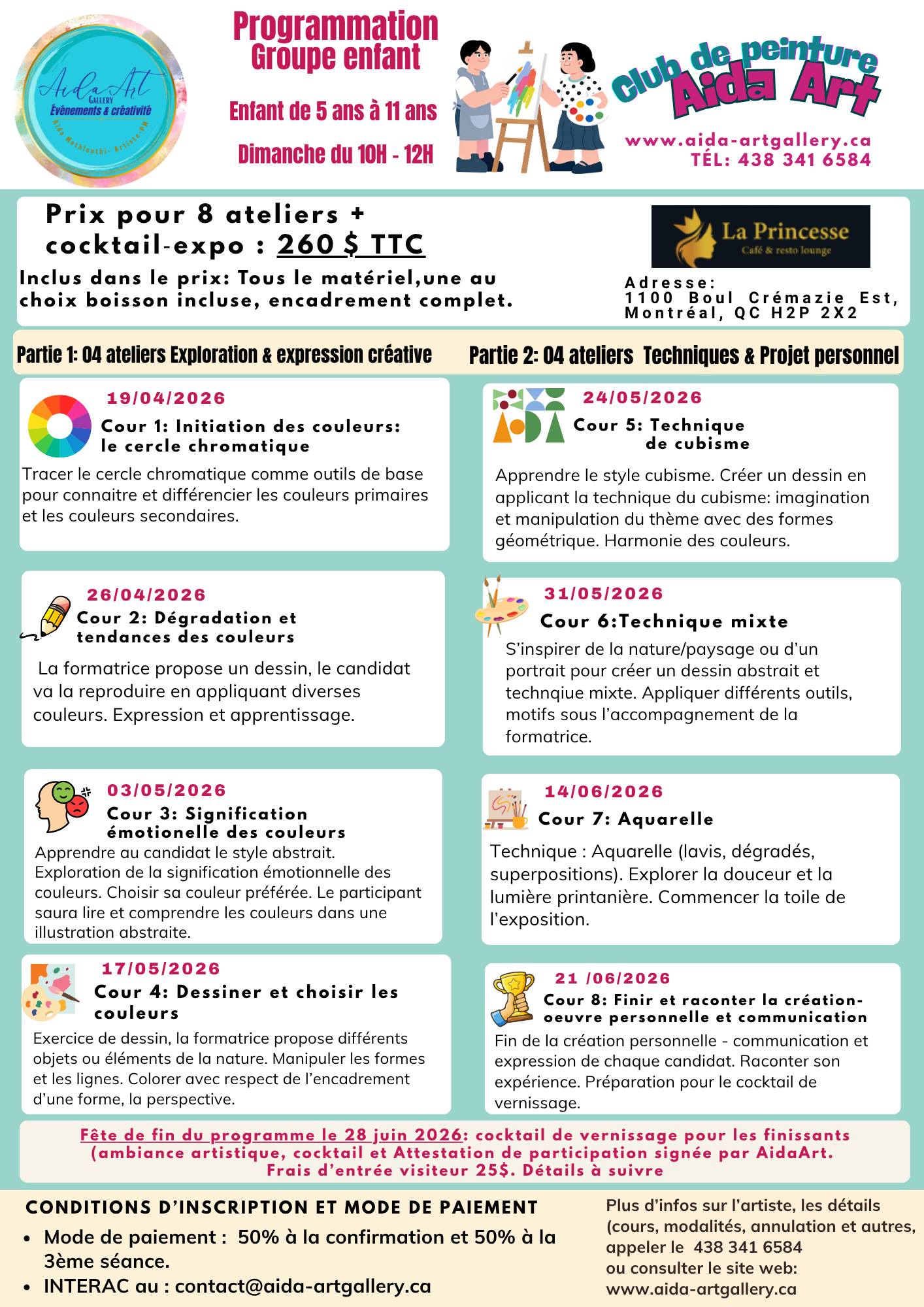 Programmation détaillée vous seras communiqué par courriel, n’hésitez pas de me contacter : contact@aida-artgallery.ca